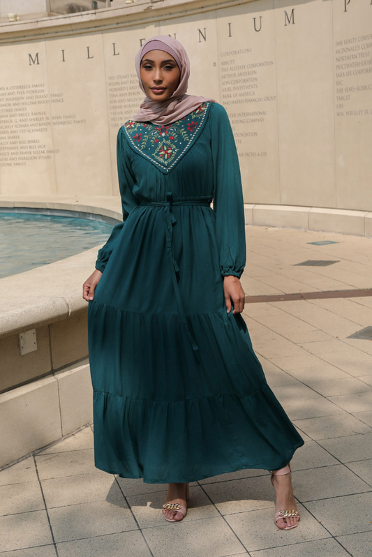EMBROIDERED YOKE MAXI DRESS - EMERALD