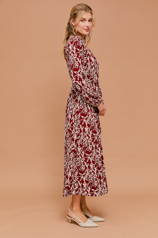 Long Sleeve Mock Neck Waist Elastic with Tie Dress - Rust-white Floral