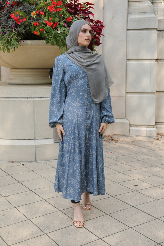 VISCOSE FLORAL BUTTON DOWN MAXI DRESS - ELEMENTAL BLUE